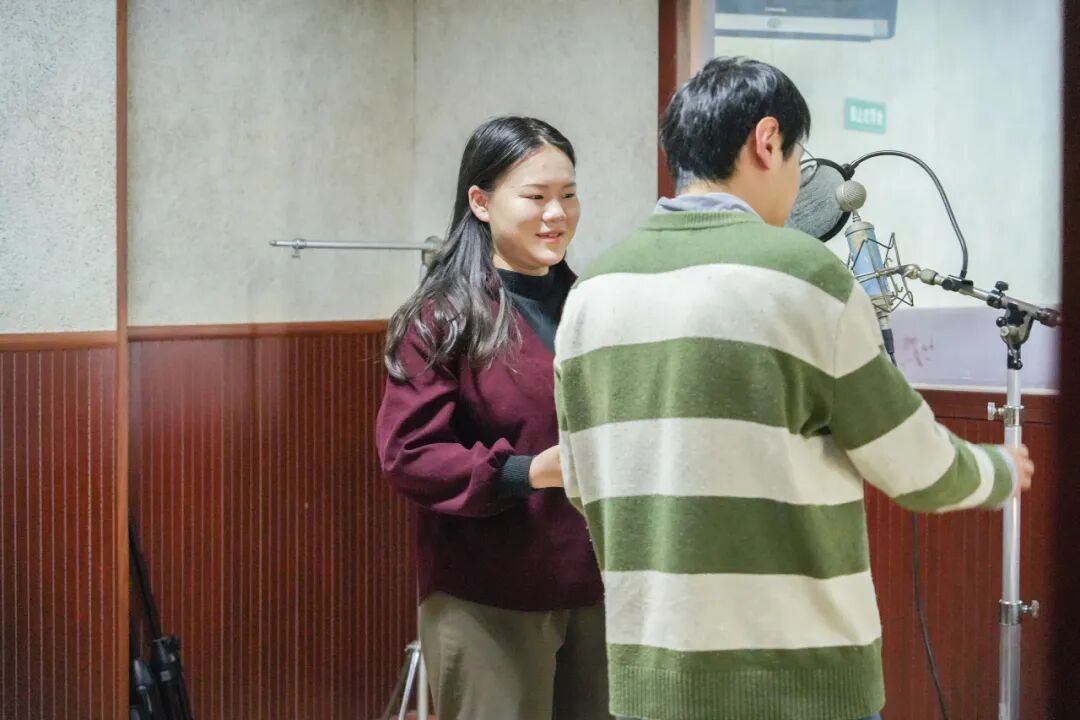 董昊老师帮助配音同学调节话筒,现场指导录制