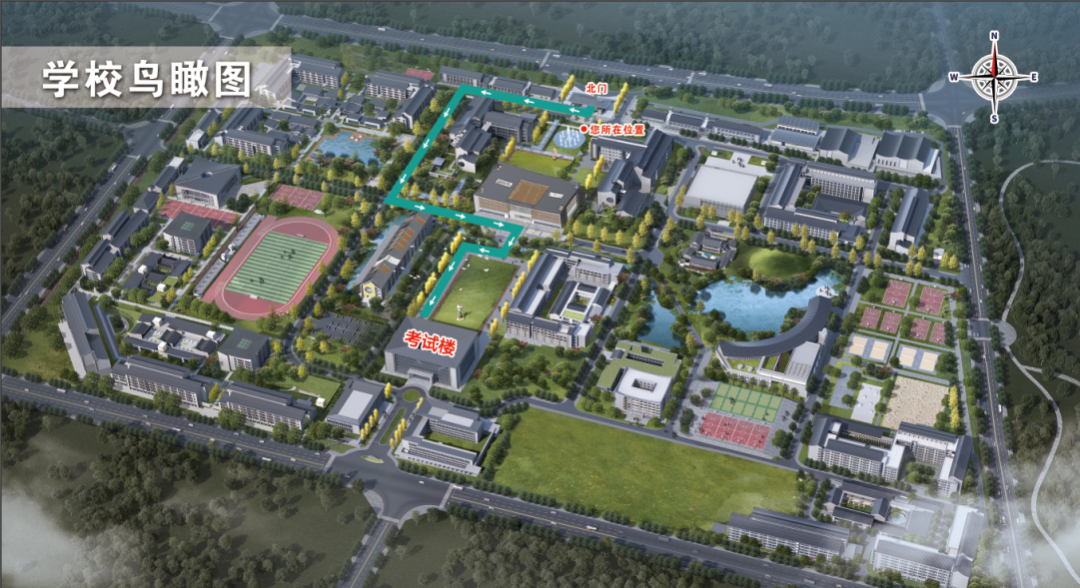 考场指引路线图考生可以在3月1日下午凭准考证和身份证提前进校看考场。
