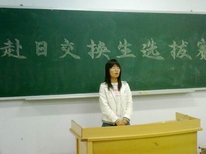 宋梦姝,东方语言学院2008级日语1班学生,2010年获全额奖学金,2011年3月作为交换生到日本关西国际大学学习。第一学期期末考试,该生成绩在其他留学生中位列第一,受到国外大学领导和老师的高度评价。她再谈学习体会时说:听、说、读、写是学习语言的基本功,仅仅靠课上的45分钟是远远不够的,滨海学院要求的早读锻炼了自己的口语和听力,持之以恒的坚持让自己很快适应了国外的授课方式。学习语言没有捷径,在国内时给自己规定每天听多长时间的听力,读多少篇短文,记多少个单词,写多少篇文章。虽然每天很累,但更多的是充实。到了日本,和老师、同学的交流没有困难,也更加坚定了自己学习的信心。