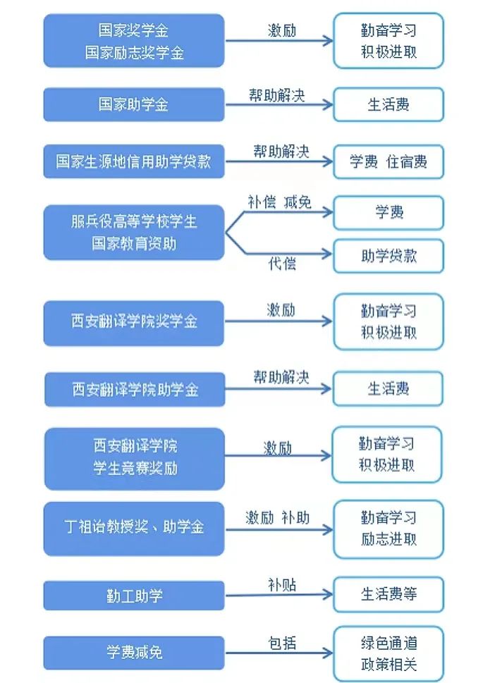 为表彰优秀学生,资助家庭经济困难的学生完成学业,学校按照国家和陕西省相关政策建立起以国家奖助学金、学校奖助学金为主体,以国家生源地信用助学贷款、服兵役学生国