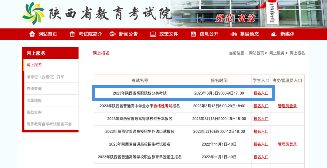 进入官网申请登录陕西省教育考试院门户网站(网址:https://www.sneea.cn)或陕西招生考试信息网(网址:https://www.sneac.com)点击“网上报名”,选择“2023年陕西省高职院校分类考试考生申请”一栏,点击“申请入口”,按步骤操作向我校提出入学申请即可。