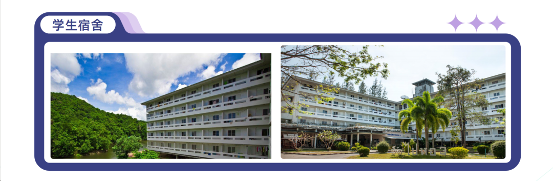 校内提供双人间学生宿舍,24小时安保,并配有独立卫浴、空调、书桌,以及公用洗衣房等各项完善的基础设施;校内外餐厅、便利店、自助洗衣店、咖啡厅等日常学习和生活所需的各类配套设施齐全。