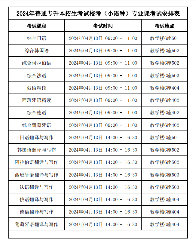 今年我校专升本校考科目(小语种)考试考场均安排在G座教学楼,各专业考场地点及具体考试时间如下: