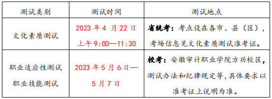 备注:考试的具体时间、考场见准考证。(三)校考缴费与准考证领取1.参加文化素质测试的考生,在省考试院规定的时间登录gkbm.ahzsks.cn 自行打印文化素质测试准考证,具体安排和操作办法请关注省考试院网站和微信公众号。2.报考我校且文化素质测试合格的考生,于 2023 年 4 月 29 日—5 月 3 日 16 :00 登 录 我 校 官 网 缴 费 , 缴 费 平 台 网 址 :http://zfpt.ahsjxy.cn/gxsf/,考试费用为 100 元/考生。2023 年 5月 5 日考生登录 zsxxw.ahsjxy.cn 查询校考准考证号及其他校考信息。因网络问题缴费不成功的考生本人可联系我校招生办解决(咨询QQ 群 :996909279,电话:0551-63617105,63617103)。(四)成绩公布及复核办法文化素质测试结果由省考试院统一发布,具体查询办法请关注省考试院网站及微信公众号。职业适应性测试和职业技能测试成绩由安徽审计职业学院统一发布,考生可以在 2023 年 5 月 10 日之后,登录安徽审计职业学院校考测试平台查询校考测试结果,如有疑问可在 2023 年 5 月 10 日-11日拨打 0551-63617007 进行复核。(五)录取成绩文化素质测试合格的考生,依据考生入学测试成绩进行录取。符合免文化素质测试的考生,其入学测试成绩=职业技能(职业适应性)测试成绩×6,其他考生入学测试成绩=文化素质测试成绩×40%+职业技能(职业适应性)测试成绩×3×60%。录取办法