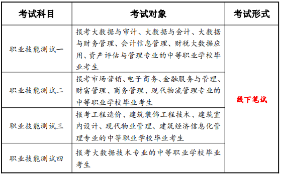 3.职业技能测试主要考核考生综合专业能力和岗位技能、通用技术等,包括:①专业能力测试;②技术技能测试两个部分。(中职学校、中等技工学校等中等职业学校毕业考生参加职业技能测试)