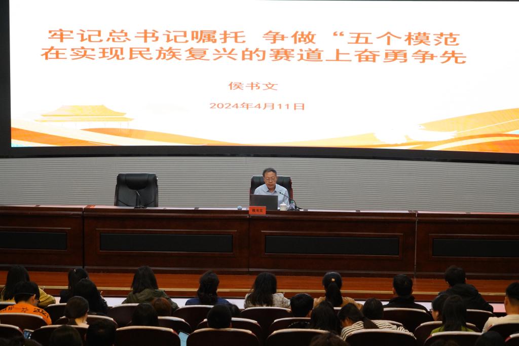 侯书文以“牢记总书记嘱托,争做‘五个模范’,在实现民族复兴的赛道上奋勇争先”为题作了首场讲座。侯书文结合我党党史和毛泽东主席、习近平总书记的经历,结合当前国际形势,用一个个鲜活的事例,生动阐释了新时代青年如何“做理想远大、信念坚定的模范,做刻苦学习、锐意创新的模范,做敢于斗争、善于斗争的模范,做艰苦奋斗、无私奉献的模范,做崇德向善、严守纪律的模范”。