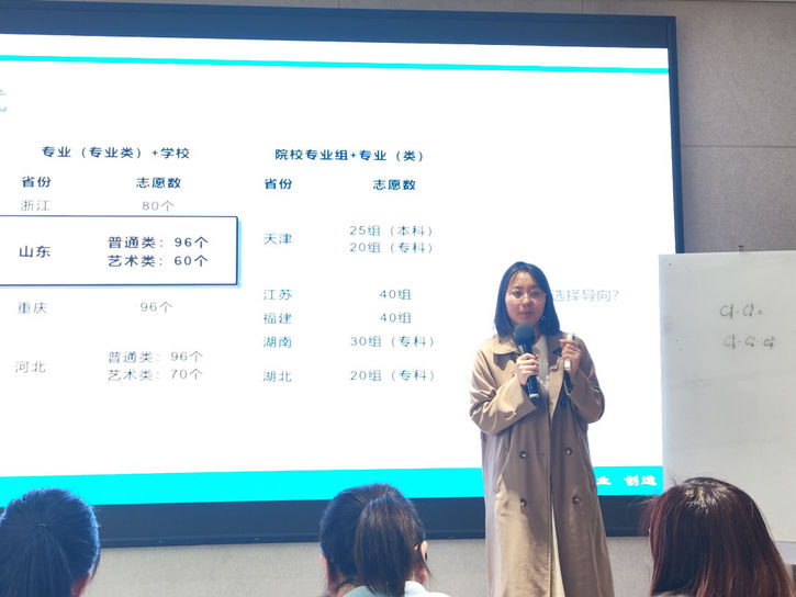 培训期间,马晓雨老师详细介绍了自新校区建立以来学校在开户省份、计划设置、招生人数等方面的规模变化,说明了新高考改革的进程和特点,并从各省高考改革的执行情况、选考科目、志愿设置、投档方式等方面分析了不同省份的高考政策。同时,马老师还结合学校现有的招生类型、招生批次和招生专业向各位老师解释了志愿填报的方式方法和投档规则,帮助老师们为考生提供更加专业精准的指导和帮助,确保考生能够根据自己的实际情况和兴趣选择适合的学校和专业。