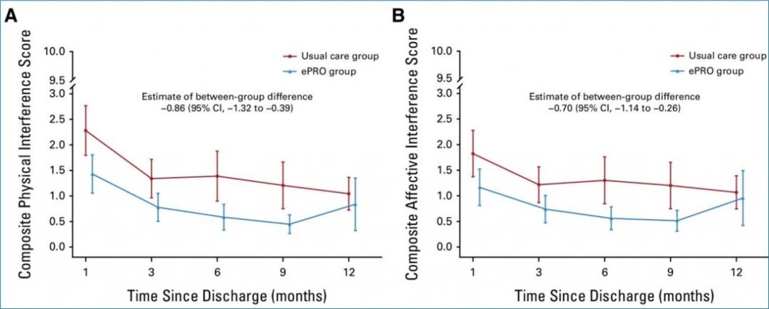 本研究为一项多中心随机对照临床试验(CN-PRO-Lung 2)的长期追踪报告,旨在评估电子化患者报告结局(ePRO)症状管理策略在肺癌手术患者出院后1至12个月内的长期效果。研究结果表明,在出院12个月时,相较于常规管理组,ePRO管理组患者报告的症状阈值事件数量(疼痛、咳嗽、气短、乏力、睡眠不安等任一症状超过预警值4分)显著减少(M[IQR],0[0-0] vs 0[0-1];P=0.040)。此外,在出院后1至12个月期间,ePRO管理组患者的生理功能干扰评分(-0.86 [95% CI, -1.32 to -0.39])和心理功能干扰评分(-0.70 [95% CI, 1.14 to -0.26])均明显低于常规管理组。
