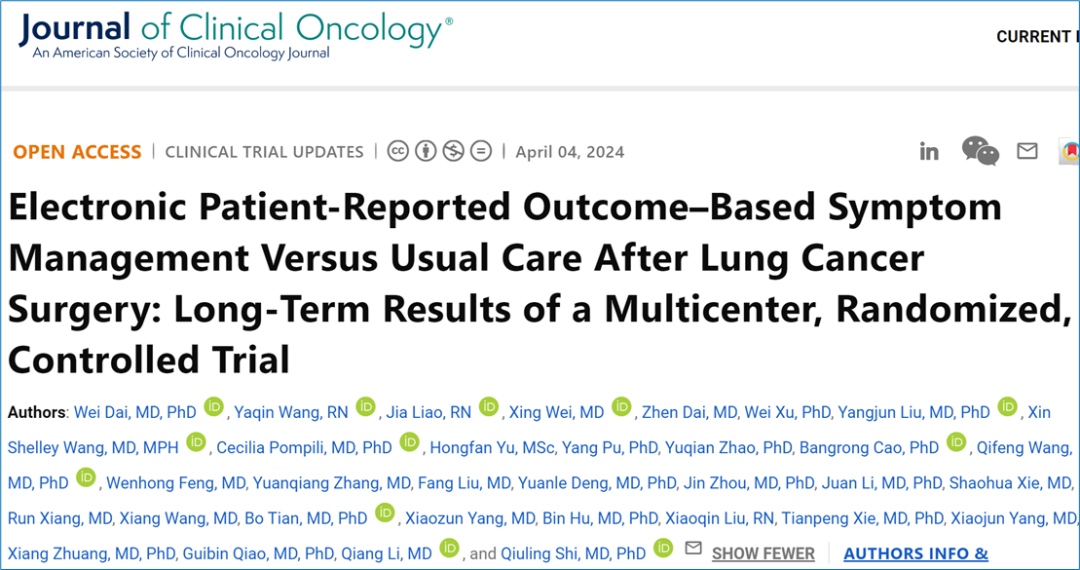 CN-PRO-Lung 2研究的近期结果于2022年1月在JCO期刊上发表,该研究证实了ePRO症状管理模式在肺癌术后短期(出院后1月内)症状控制方面的优越性。而本次远期结果的公布,进一步强调了ePRO症状管理模式对于长期(出院后1-12月)症状控制及日常功能改善的作用。至此,CN-PRO-Lung 2研究在全球外科领域率先证明了“以患者为中心”的PRO照护模式,无论是在短期还是长期,都能为患者带来显著的益处。这一发现为将PRO管理模式融入日常临床实践提供了强有力的科学支撑。此外,鉴于当前临床医务人员工作负担重和肺癌手术患者日益年轻化的趋势,本研究立足实际,创新性地提出了基于PRO的“术后早期频繁干预”方案。特别是在患者出院后第一个月这一关键康复期,该方案通过科学、及时、有效的干预,为患者的快速康复提供了坚实的保障。