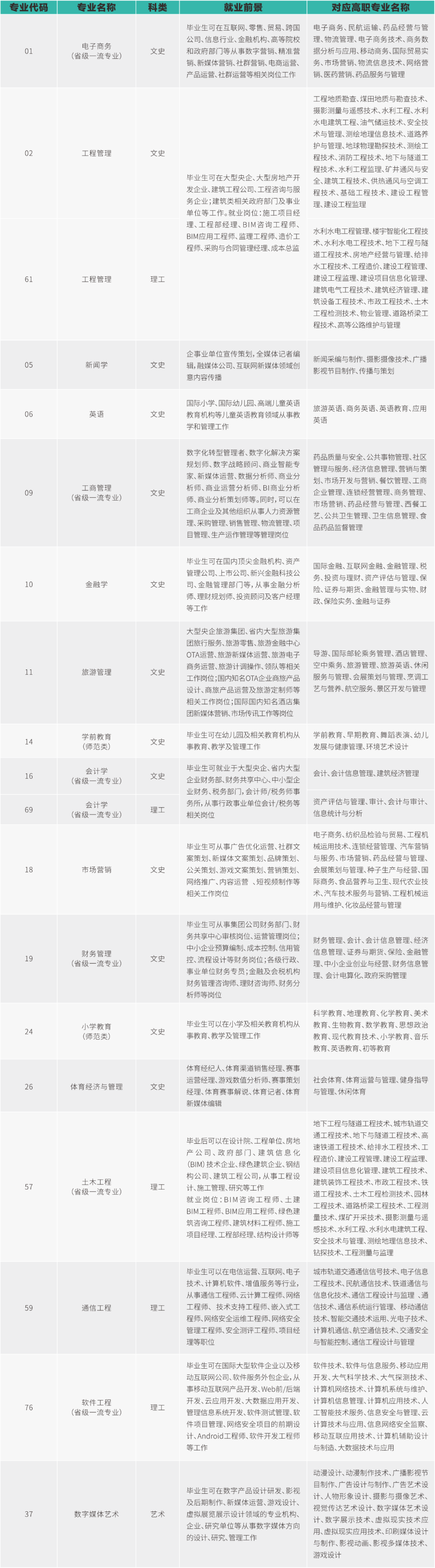 电子商务、民航运输、药品经营与管理、物流管理、电子商务技术、商务数据分析与应用、移动商务、国际贸易实务、市场营销、物流信息技术、网络营销、医药营销、药品服务与管理。
