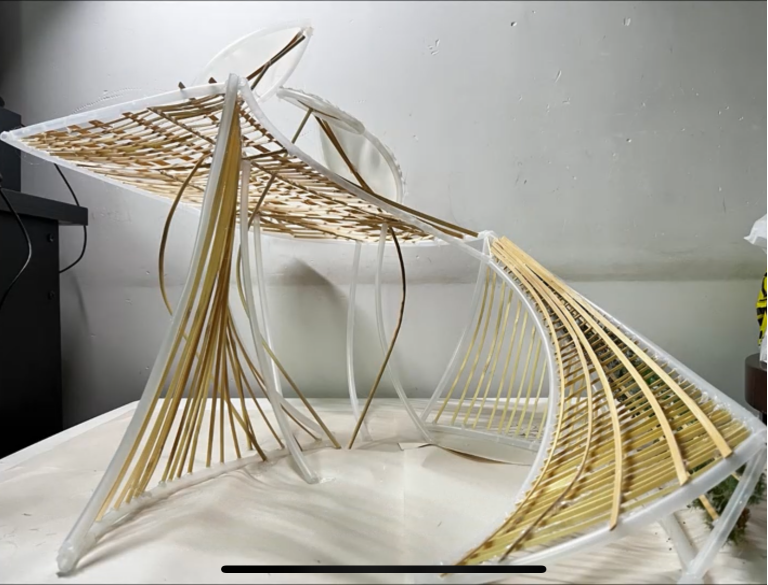 为了获得更确定的设计结果,团队拜访道明竹艺村竹编传承人的工作室,见识到了原本挺拔的竹子,通过选料、裁料、破篾、打磨等极耗时、重复再重复的步骤,成为精美的竹编工艺品的过程。“对我们后续利用竹材进行创作时有很大的启发。”
