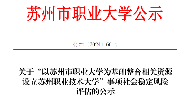 近日,苏州市职业大学官网发布《关于以“苏州市职业大学为基础整合相关资源设立苏州职业技术大学”事项社会稳定风险评估的公示》。