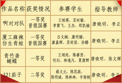 我校“啊对对队”组,获得兴农机械赛道一等奖,是兴农机械赛道全省唯一晋级国赛的私立高校队伍;“厦工麻辣仿生青蛙”组,获得仿生青蛙赛道一等奖,晋级国赛。让我们期待他们在今年7月的第十一届全国大学生机械创新设计大赛上再创佳绩!