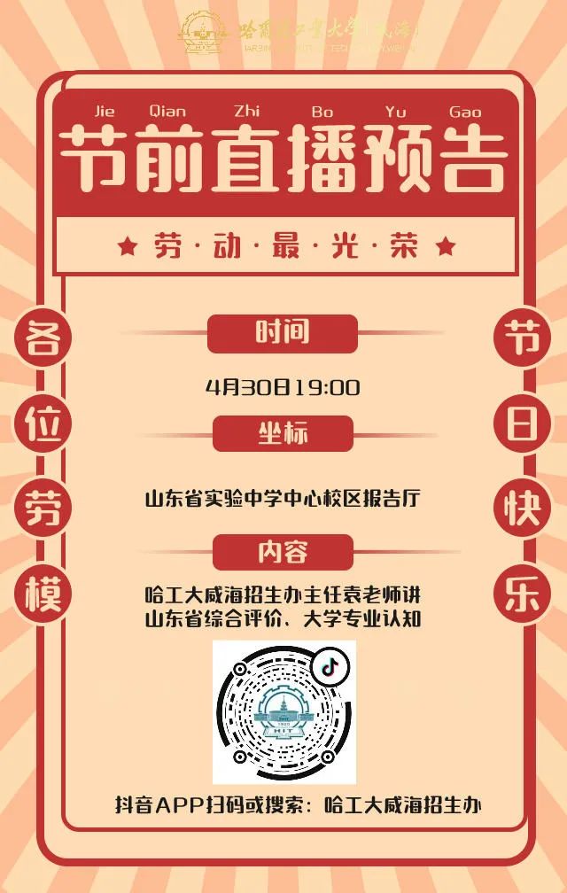 直播间里的每一个你都是访谈主持人问你最想问的问题,直击痛点!谈笑间聊透高考的那些烦心事。2021年“招办直播聊高考”活动如约而至,4月30日(周五)19:00招生办副主任袁伟芝将在抖音直播间,与家长和同学们共同聊聊如何理解山东省综招政策和大学专业,以及如何通过综招进入你梦想的那座殿堂和选择自我合适的大学专业。