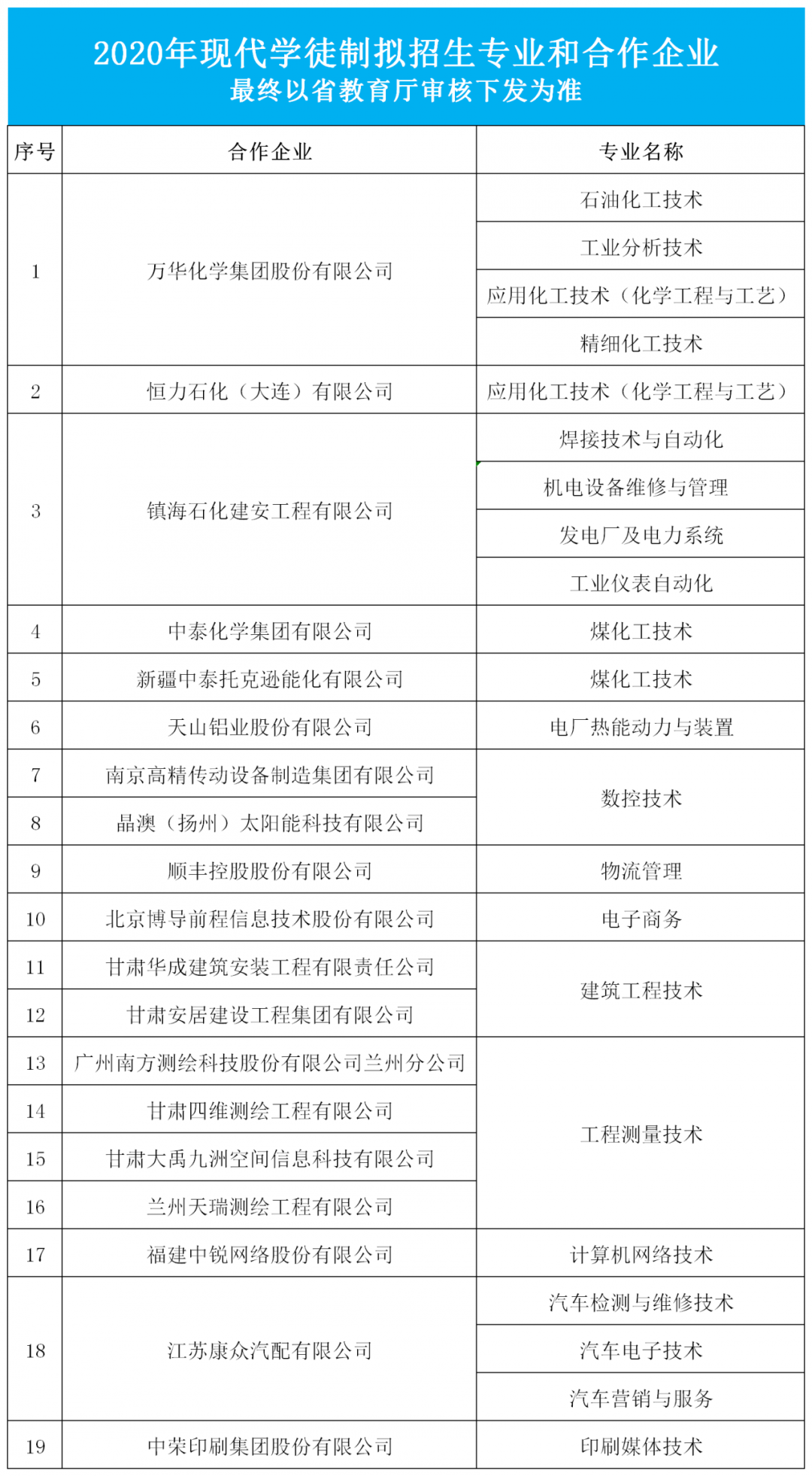 为积极推行现代学徒制订单招生及人才培养工作,实现招生即招工,入学即就业,切实提高人才培养的质量与针对性。2020年我校目前拟与19家优质企业合作推行现代学徒制订单招生与人才培养。