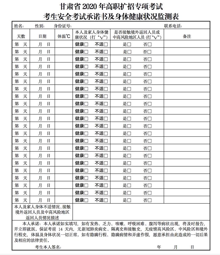 2.2020年甘肃省高职扩招专项考试考生安全考试承诺书及身体健康状况监测表