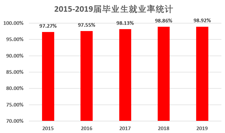 毕业生一次性就业率连续多年超过98%,2019届毕业生规模以上企业录用比例为75.75%,500强企业录用比例为58.74%,质量年报显示,2019届毕业生月平均收入为4802元,其中年收入10万元以上达到25%。2020届毕业生签约率已达到97.54%,500强企业录用比例为60%。截止目前,2021届毕业生就业率超过95%。