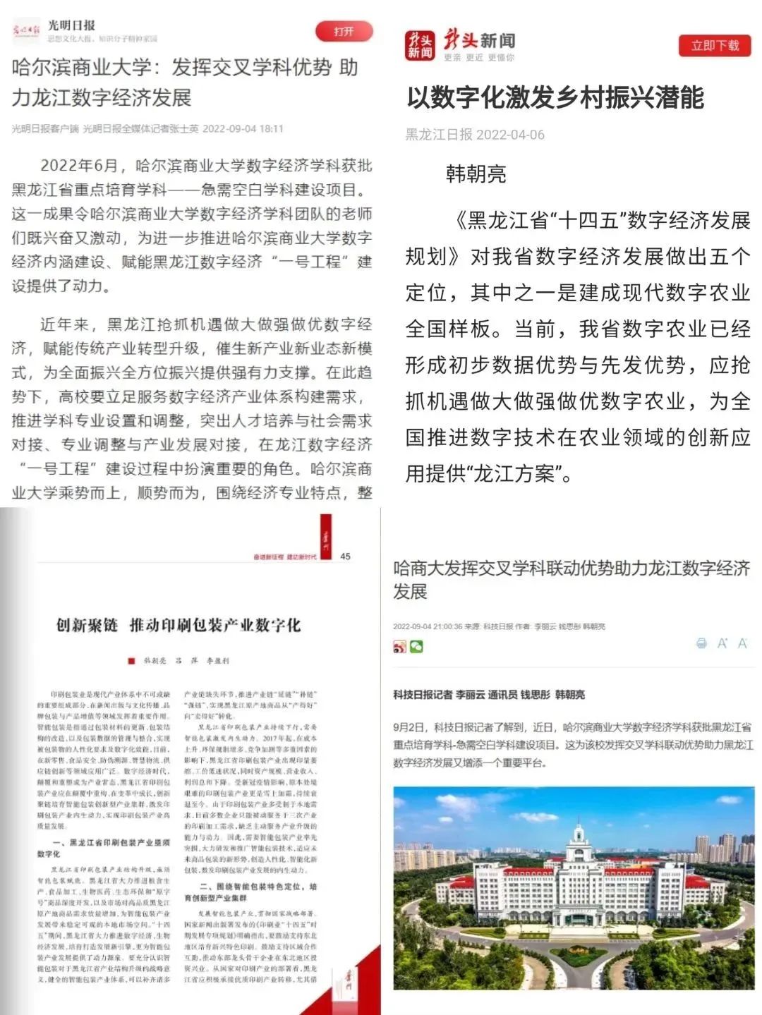 发展数字经济是把握新一轮科技革命和产业变革新机遇的战略选择。近年来,黑龙江省抢抓机遇做大做强做优数字经济,赋能传统产业转型升级,催生新产业新业态新模式,为高质量发展可持续振兴提供强有力支撑。作为龙江数字经济“一号工程”建设的重要参与力量,哈尔滨商业大学数字经济学科团队明确学科发展路径,整合专业优质资源,突出人才培养与社会需求对接、专业调整与产业发展对接,协同开展数字经济研究攻关,助力龙江数字经济建设与发展,打造龙江经济发展新引擎。