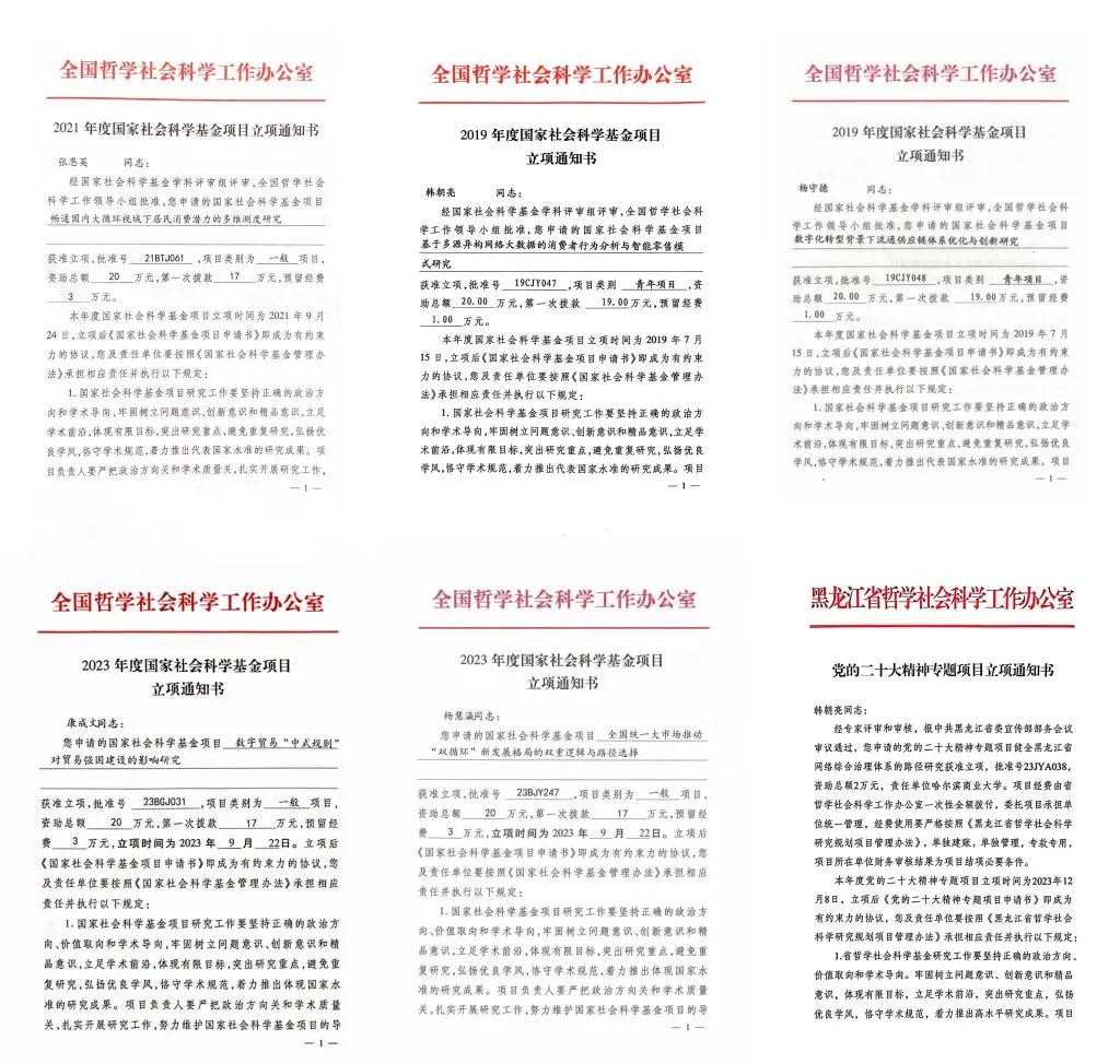 凝聚科研团队力量 引领学科专业发展坚持专业融合发展、学科交叉创新,建设一支教学与科研相结合、模式与技术相结合、研究与应用相结合的学科团队。数字经济学科团队现有成员30人,其中教授12人,副教授10人;拥有博士生导师10人,省级人才8名,省级领军人才梯队3个。2023年,数字经济团队先后主持完成相关科研项目48项,主持完成国家级科研项目3项,省部级科研项目35项,横向课题(落地规划)10项,发表SCI、SSCI、CSSCI等论文22篇,出版学术著作13部,获得科研奖励9项。经过不断探索,形成了一支教学、科研和实践相结合,结构合理、业务精湛、融合互动的一流学科队伍,获评哈尔滨商业大学学科创新团队培育计划,为国家和黑龙江省培育数字经济新引擎提供全方位人才与智力支撑,成为黑龙江省重点区域与关键产业顶层设计的优选团队。