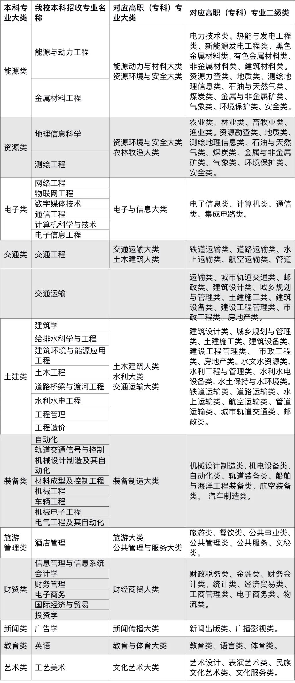 2024年高职(专科)升本科招生施行大类招生录取原则,我校共有11个专业大类38个本科专业招收“专升本”学生,学制为两年。招生专业及对应高职(专科)专业大类详见下表: