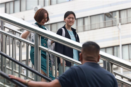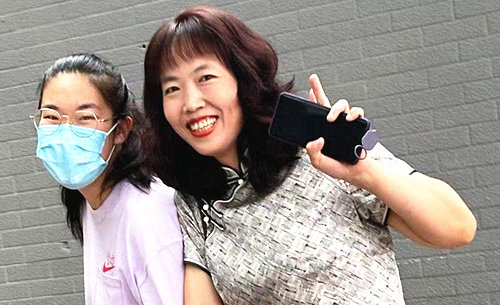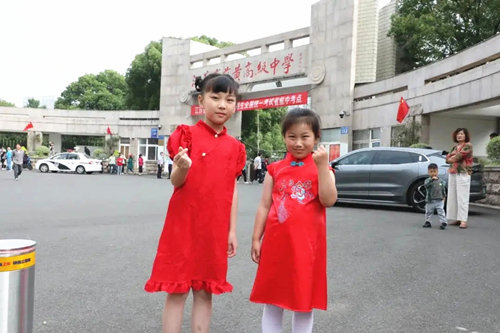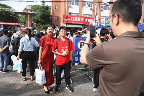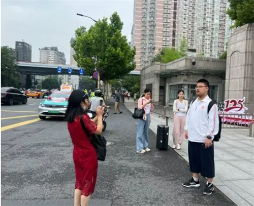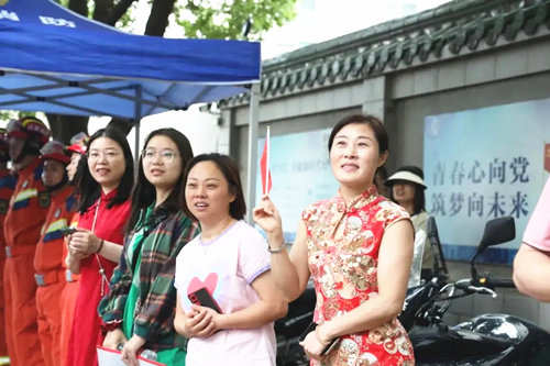 2024夏季高考第一天,济南山师附中考点外,母亲身穿旗袍,开心送考。