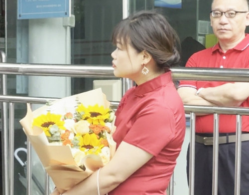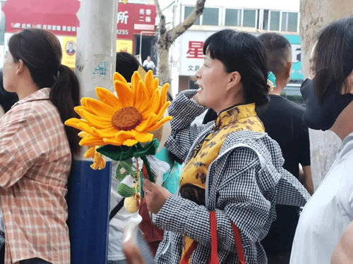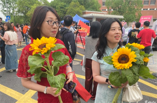 一位妈妈抱着一把手工编织的向日葵花束,来给女儿送考。