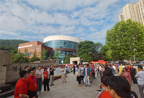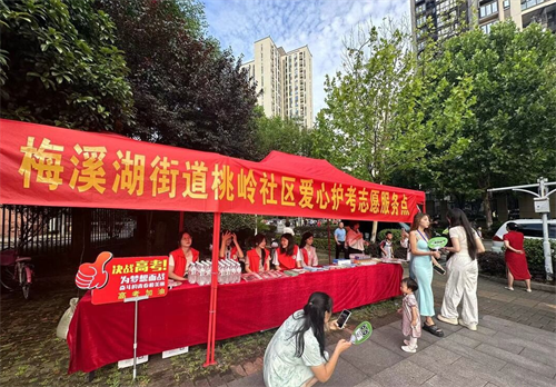 湖南师大附中梅溪湖中学考点,梅溪湖街道桃岭社区设立爱心护考志愿服务点,免费发放矿泉水、考试文具等爱心助考物品。