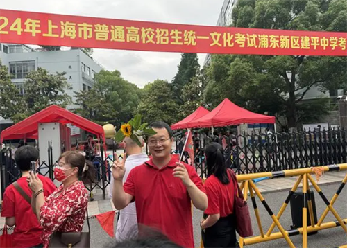 上海浦东新区建平中学考点。考点外,高考学生、家长、送考