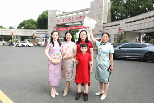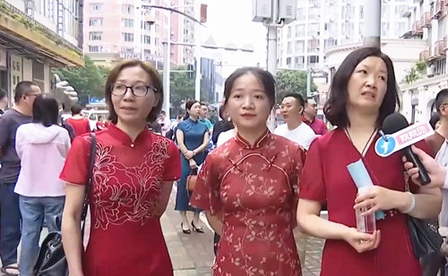 考点外,家长身着旗袍为考生加油!