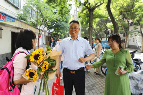 考生家长手捧鲜花等待孩子考试。