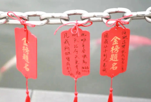 蔡妈妈去北京,专门在孔庙买了个胸针,上面写着“金榜题名”。