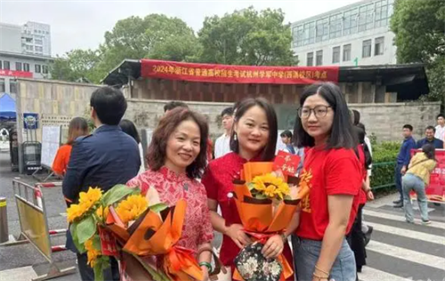 7点15分,学军中学门口,三位妈妈穿着红色的旗袍,手拿向日葵送孩子进考场。