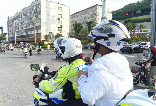 6月7日8时许,铁骑民警迅速驾驶摩托车,为考生佩戴好安全头盔后,载着考生迅速赶往长安一小考场。