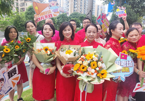 在重庆高考考点外看到,许多家长手捧鲜花,为考生加油送考。