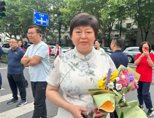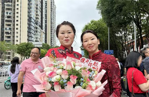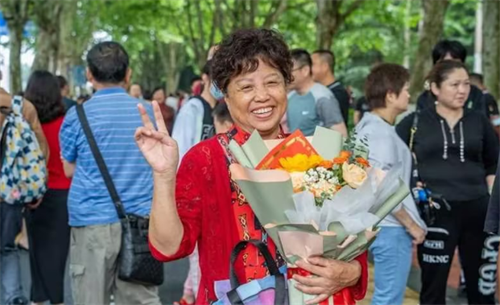 一考生母亲手捧鲜花,一袭旗袍预祝旗开得胜。
