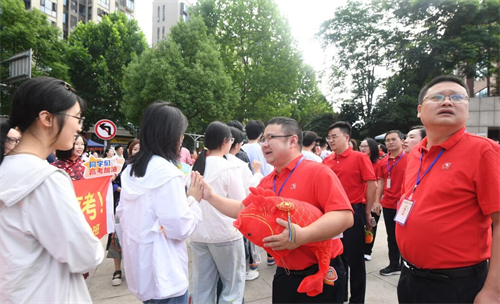 家长穿红衣为考生加油打call。