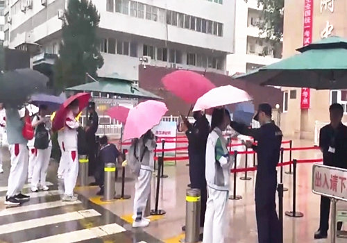 家长打着伞,在雨中送考!