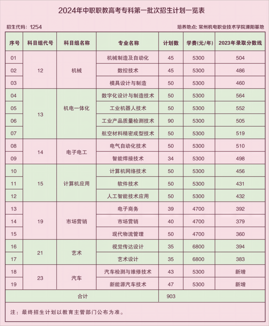 2024年中职职教高考专科第一批次总计划903个、7大科目级19个招生专业,较2023年计划增量了163个,大大提升报考我校考生录取概率。