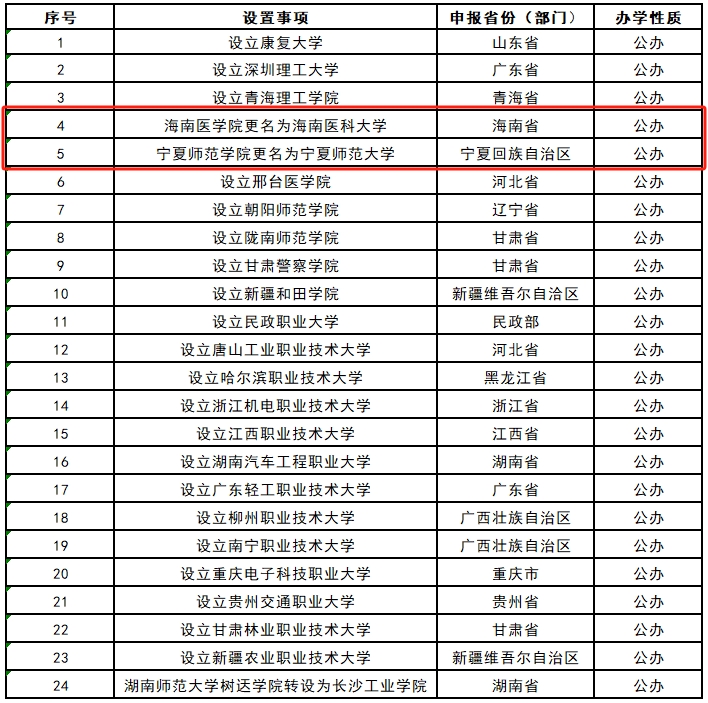 近年来,针对高等教育领域中,地域分布不均衡及某些行业领域缺乏高校的问题,我国积极推进新大学的建设。据教育部官网显示,拟同意设置海南医科大学、宁夏师范大学等24所新大学。具体名单如下:
