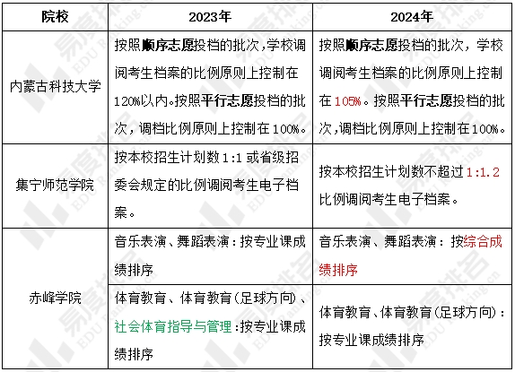 内蒙古科技大学顺序志愿投档的批次调档比例从120%变更为105%,平行志愿调档比例未发生改变。集宁师范学院2024年调档比例从1:1更改为1:1.2。