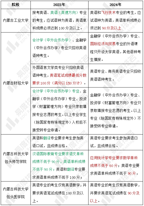 内蒙古工业大学、内蒙古科技大学包头师范学院、内蒙古科技大学包头医学院、内蒙古民族大学等多所高校英语专业对高考英语单科成绩要求降低,内蒙古财经大学英语、商务英语专业2024年取消对英语单科成绩要求。