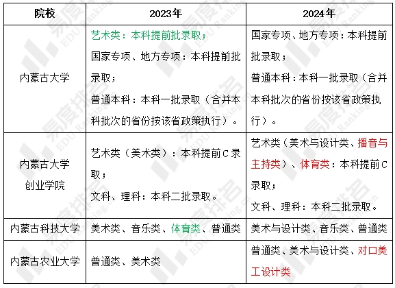 表1 内蒙古本科院校2023-2024年录取批次及专业类变更