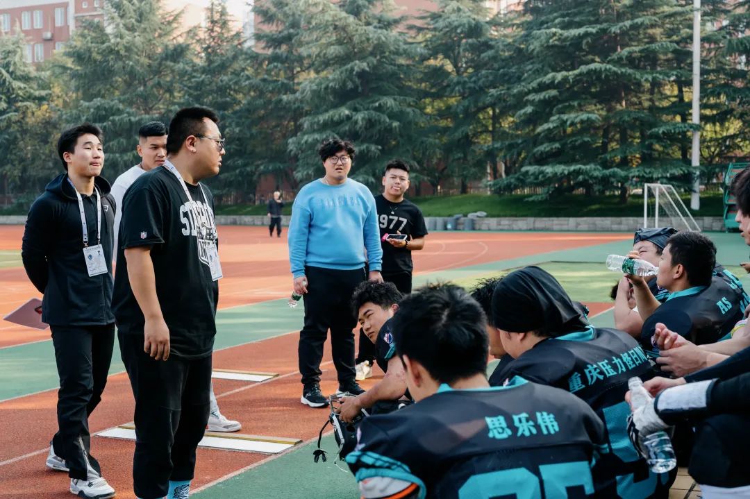 比赛中场休息时杨鲁正在激励队员们“因为橄榄球队对于队员的身高体型并没有特别严格的要求,高矮胖瘦不同的体型都是一个球队所需要的,因此对于队员的选取我们并不挑剔。每年我们都会在体测表现优异的同学们中去挑选,并且通过各类自媒体的传播渠道,鼓励大家踊跃尝试报名。”欧亚橄榄球队队长成浩鑫说。在经过六次、一次三小时的训练时长后,身体可以坚持,并且仍然热爱这项运动,便可以加入正式球员的队列中。
