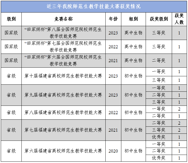 积极响应“实施新时代基础教育强师计划”,构建“模块教学+个性培养”的立体多元课程育人体系,实施针对 “教育师资型”“研究创新型”“复合应用型”不同人才分层分类的实践教学,建设适宜共享、易于扩展、虚实结合的虚拟仿真实验平台和课程资源,构建与政府、企业、科研机构深度合作的多维协同育人机制。近5年,学院学生斩获“华文杯”全国师范院校师范生教学技能(生物)大赛特等奖9项、一等奖5项;全国师范院校师范生教学技能竞赛二等奖1项、三等奖2项;福建省高校师范生教学技能大赛一等奖7项、二等奖6项、三等奖4项等。
