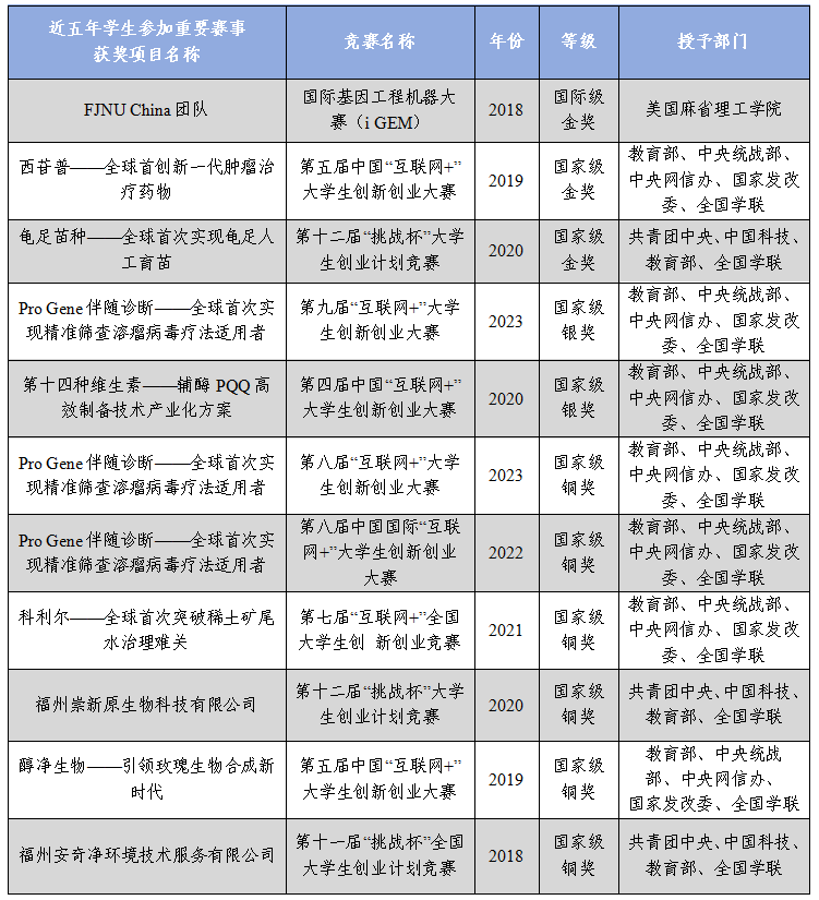 主动面向中国式现代化建设需求,着力培养青年科技人才和卓越工程师。遵循工程教育专业认证理念,创新人才培养模式,着眼于全流程学生工程能力和工程素养提升,通过拔尖生计划培养创新研究型人才、通过专业竞赛计划培养创业复合型人才、通过卓越工程师计划培养契合行业需求工程人才。近5年来,学院学生在“互联网+”“挑战杯”等全国高水平创新创业大赛中累计获金奖2项、银奖3项、铜奖7项;国际遗传工程机器大赛(iGEM)金奖1项;福建省大学生“挑战杯”系列竞赛金奖2项、银奖1项、铜奖1项;福建省“互联网+”大学生创新创业大赛金奖6项、银奖8项、铜奖3项;获全国大学生生命科学竞赛特等奖1项、二等奖2项、三等奖5项;学生团队荣获“生化精细工业科技创新团队”、大学生“小平科技创新团队”等称号。