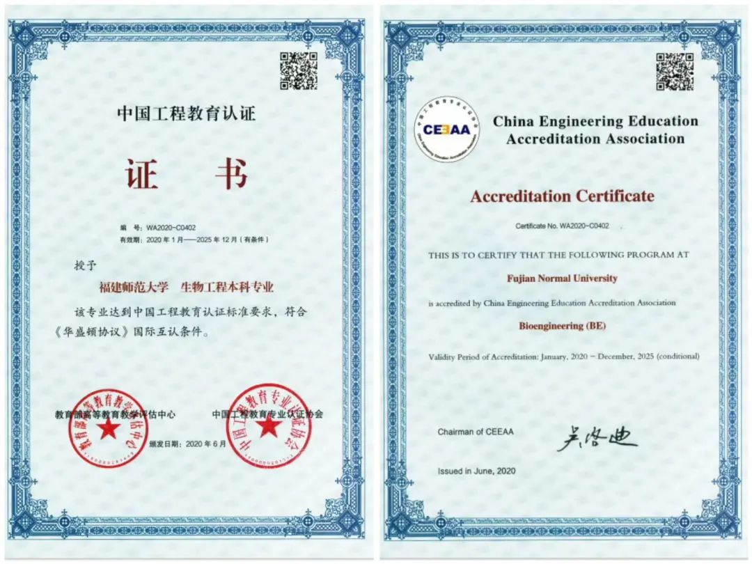 “生物工程”专业为国家级一流本科专业建设点专业、福建省一流本科专业、福建省服务产业特色专业和省级专业综合改革试点专业,是全国师范院校首个通过中国工程教育专业认证协会(CEEAA)认证的工程类专业,并同时获国际工程教育学位互认协议——《华盛顿协议》正式会员的认证。