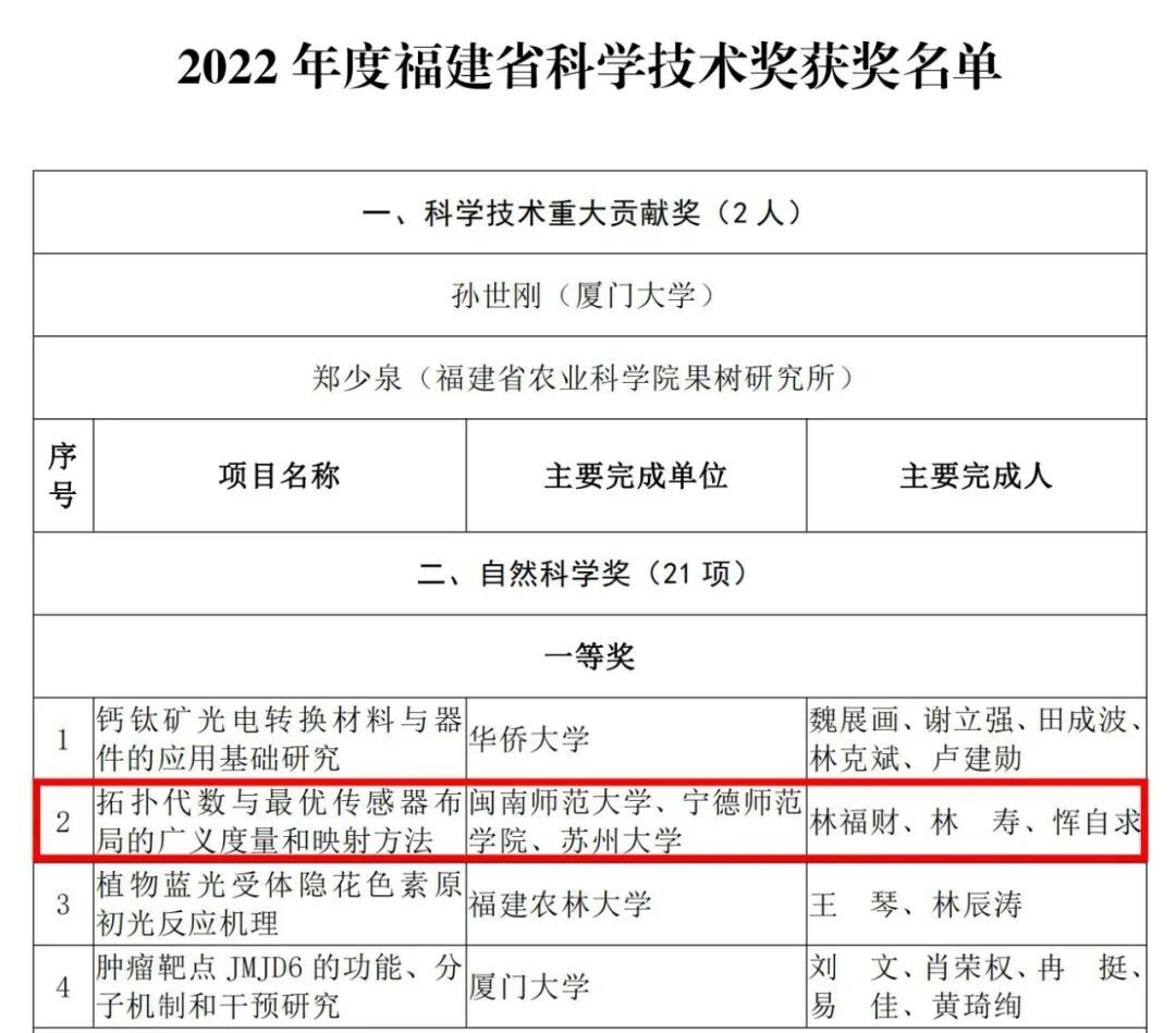 近日,福建省人民政府发布关于2022年度省科学技术奖励的决定。我校林福财教授负责的《拓扑代数与最优传感器布局的广义度量和映射方法》获得最高等级奖项——2022年度福建省自然科学奖一等奖,实现我校在自然科学领域研究新的突破。
