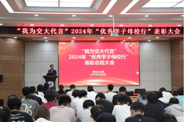 为进一步宣传我校办学成就与人才培养特色,提高学校知名度和社会影响力,促进我校与各生源中学间的深入交流合作。2024年初,招生就业处组织开展了“我为交大代言”招生宣传暨寒假优秀学子回访高中母校活动,并于6月2日在二教报告厅举行表彰总结大会。