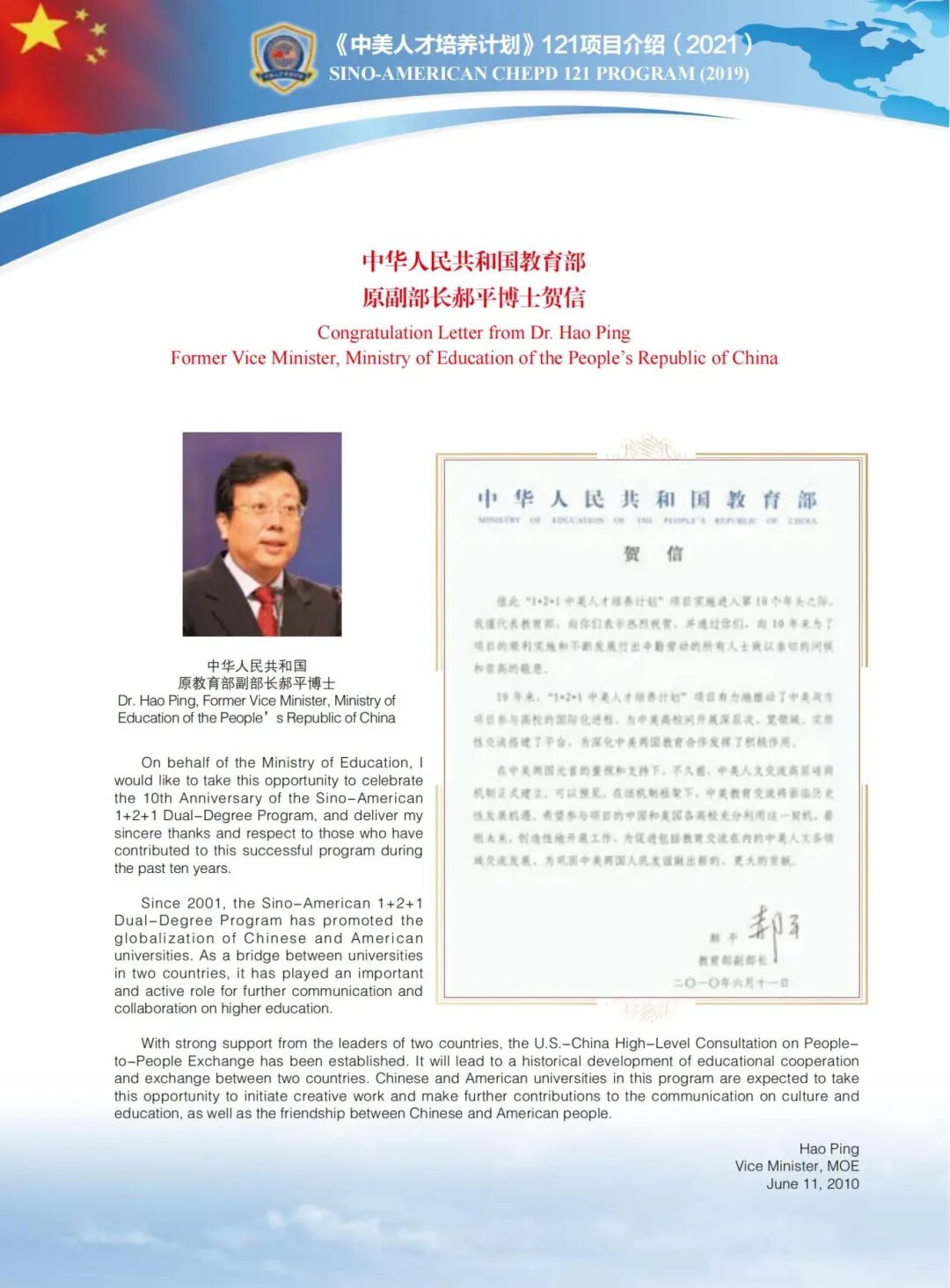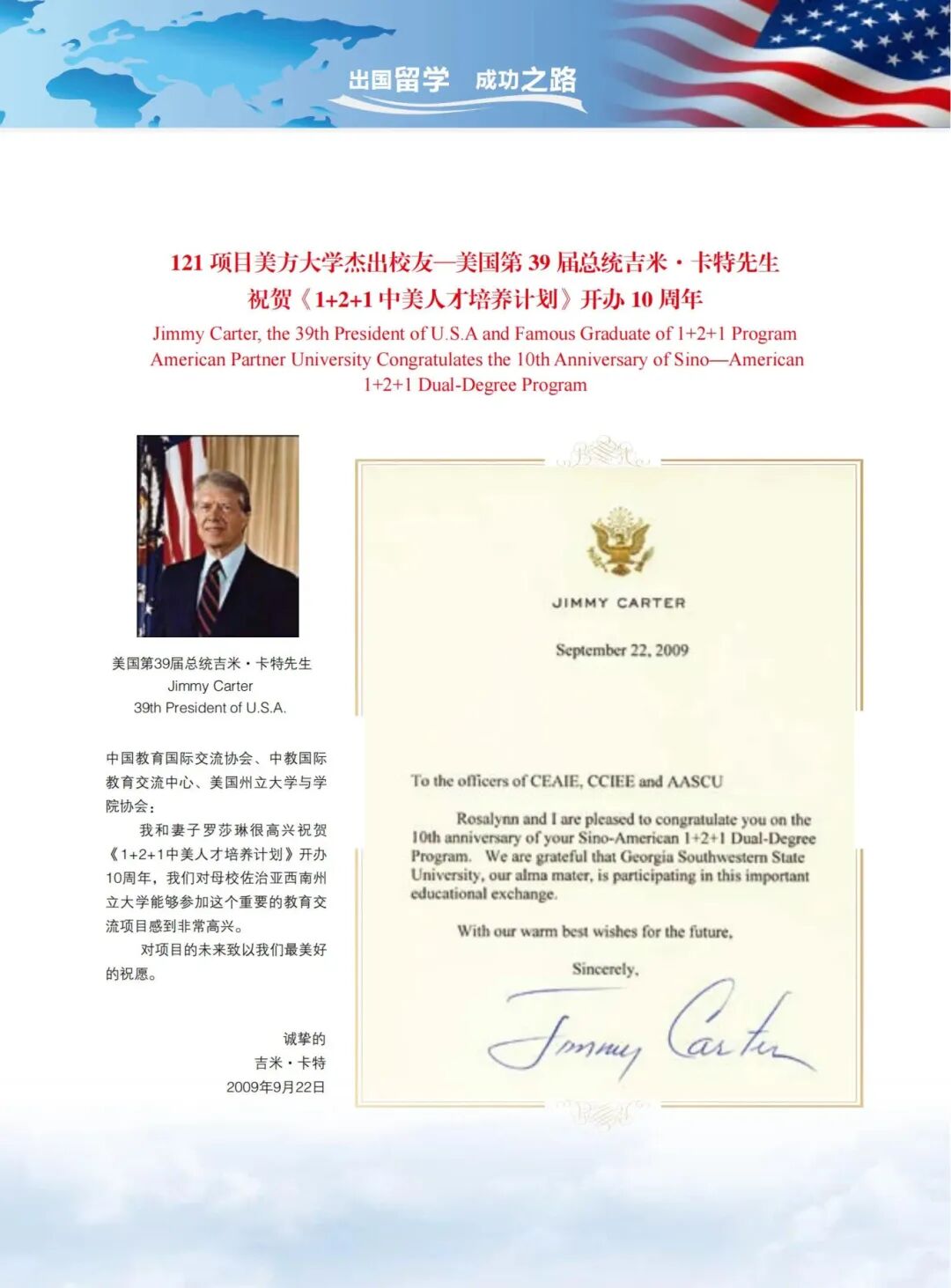 01项目背景中美学分互认双学位实验班(即“《中美人才培养计划》121双学位项目”,后称“121项目”)是“第七轮中美人文交流高层磋商机制”成果及“首轮中美社会与人文对话行动计划”执行项目,由教育部所属中国教育国际交流协会(CEAIE)、中教国际教育交流中心(CCIEE)和美国州立大学与学院协会(AASCU)共同管理。该计划自2001年开始运行,为中美人交流作出突出贡献,2010年曾获时任中国教育部副部长郝平博士与美国第39届总统吉米·卡特先生的贺信,并获教育部国际司专门批示。目前该计划共有175所中美大学参加项目(其中中方大学133所);截止到2022年,有6300多名本硕学生赴美方大学学习。