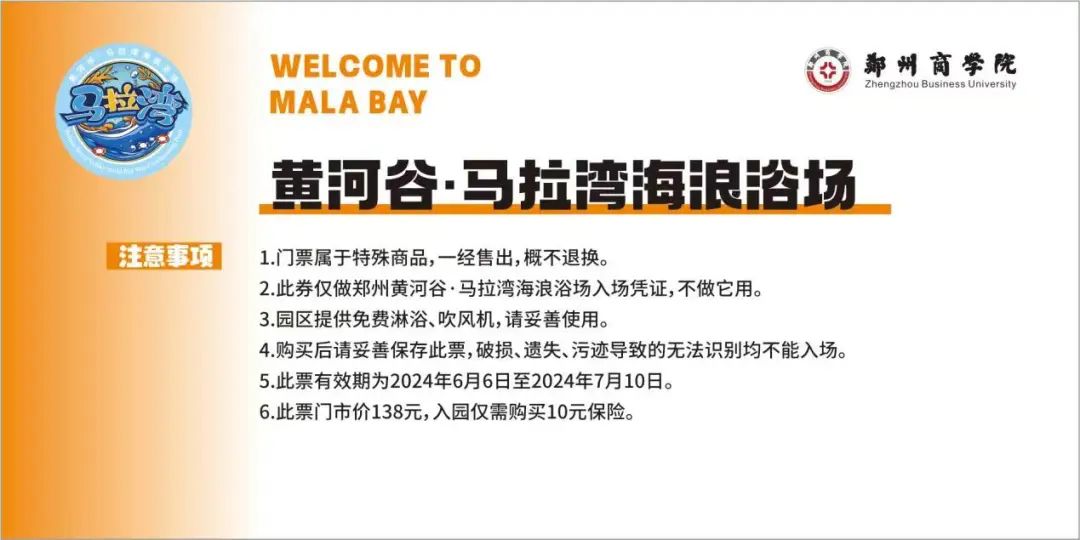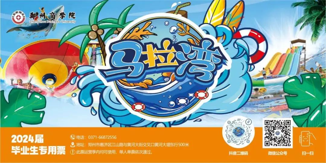 为感恩母校栽培,校友企业特联合母校,为11000余名2024届毕业生每人赠送门市价138元的黄河谷·马拉湾水上乐园门一张,开启郑商学子专场水上畅玩之旅!门票领取方式:离校前发放。